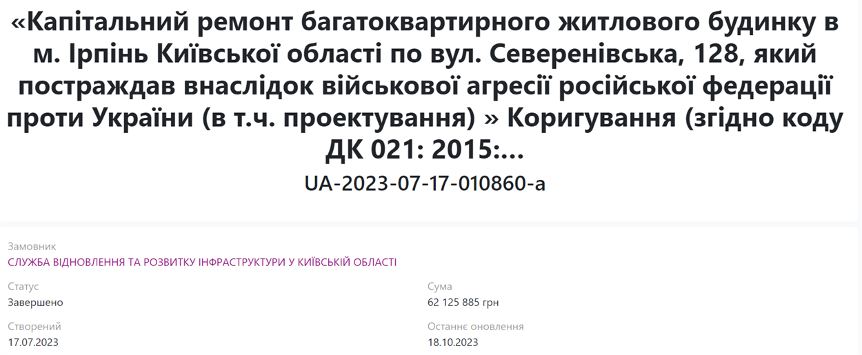 Влітку 2023 року Київська обласна держадміністрація провела тендер на відновлення комплексу, куди прийшли дві фірми: "Нідком" і "Навітехсервіс". Попри те, що пропозиція "Навітехсервіса" була дорожчою - 605 мільйонів проти 430 мільйонів гривень, перемогу через відмову першої віддали харківській компанії.