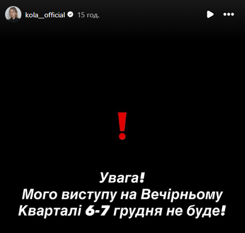 Співачка KOLA стала однією з перших, хто публічно заявив про відмову від виступу. У своїх соціальних мережах вона написала: «Увага! Мого виступу на Вечірньому Кварталі 6–7 грудня не буде! Добраніч».
