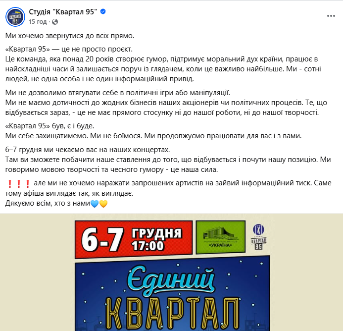 Після хвилі публічних відмов студія «Квартал 95» оприлюднила офіційне звернення. У ньому колектив наголосив, що творча діяльність студії не пов'язана з політичними чи бізнесовими процесами, що стосуються її акціонерів.