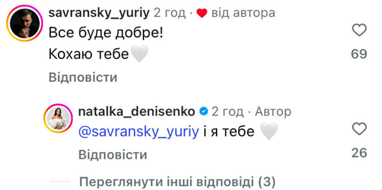 "По-перше, раджу перед тим як писати коментарі подивитися інтервʼю. Воно сповнене поваги і любові до мого минулого. По-друге: дорогі друзі, я народилася на цей світ не для того, щоби відповідати чиїмось очікуванням. Я звичайна жінка! Просто уявіть собі, окрім того, що я професіонал, публічна особистість, я ще і просто жінка! Яка виховує сина, яка миє посуд, завантажує прання, заробляє гроші на сім'ю, доглядає за собою, батьками, займається благодійністю, творчістю, розвивається… Я - звичайна земна людина, з своїм особливим характером, енергією, долею, з своїми помилками і випробуваннями, яка живе своє життя. Витримуйте мою долю! Я нічого вам не винна", - додала Денисенко.