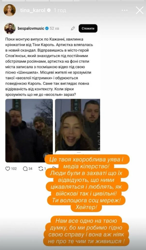 Тіна Кароль не залишила критику без відповіді. Співачка публічно звернулася до Беспалова у своєму Instagram. Вона назвала блогера «волоцюгою соціальних мереж». Артистка також прирівняла його діяльність до «медіа-кілерства». У своїй заяві Кароль підкреслила, що місцеві жителі були раді її візиту.