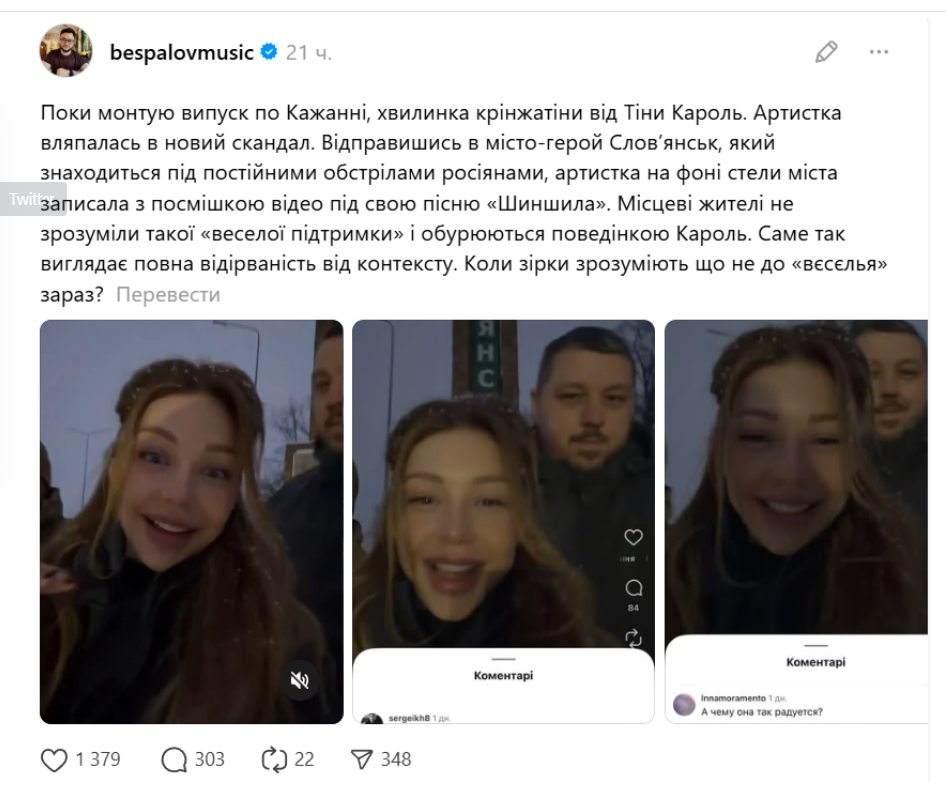 Тіна Кароль відвідала прифронтове місто Слов'янськ з благодійним виступом. Співачка традиційно поділилася враженнями у соцмережах. На одному з відео артистка усміхнено співає пісню «Шиншила» на тлі стели при в'їзді до міста. Для когось це виглядало як щира підтримка. Для інших — як недоречна веселість у важкі часи.