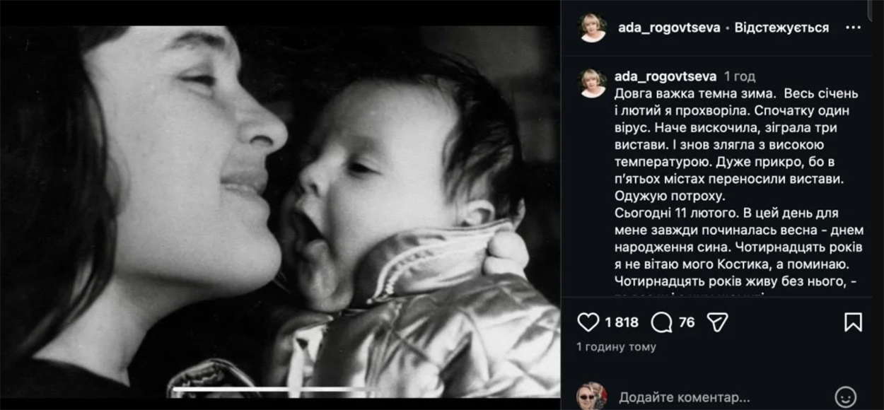 11 лютого для Ади Роговцевої завжди був особливим днем — днем народження її сина Костянтина. Проте вже 14 років цей день приносить не радість, а біль спогадів. Молодий чоловік помер від онкологічного захворювання у 2011 році.