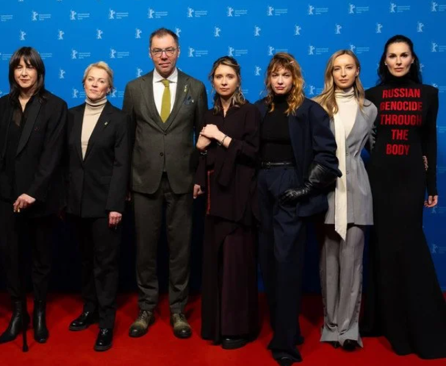 На Берлінале-2026 Маша Єфросиніна з'явилася в закритій чорній сукні з довгими рукавами і високою горловиною — нарочито стриманій, без жодного прикраси. Весь акцент — яскраво-червоний напис на грудях: Russian genocide through the body («Російський геноцид через тіло»).