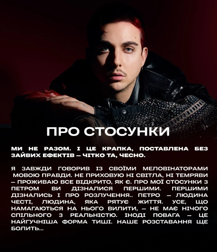За словами артиста, повернення до попередніх стосунків неможливе. «Ми не разом, і це крапка, поставлена без зайвих ефектів — чітко та чесно», — написав MELOVIN.