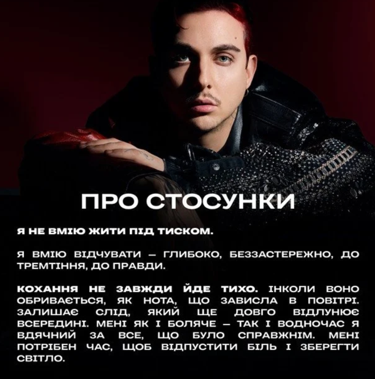 «Кохання не завжди йде тихо. Інколи воно обривається як нота, що зависла в повітрі, залишає слід, який ще довго відлунює всередині. Мені потрібен час, щоб відпустити біль і зберегти світло», — підсумував артист.