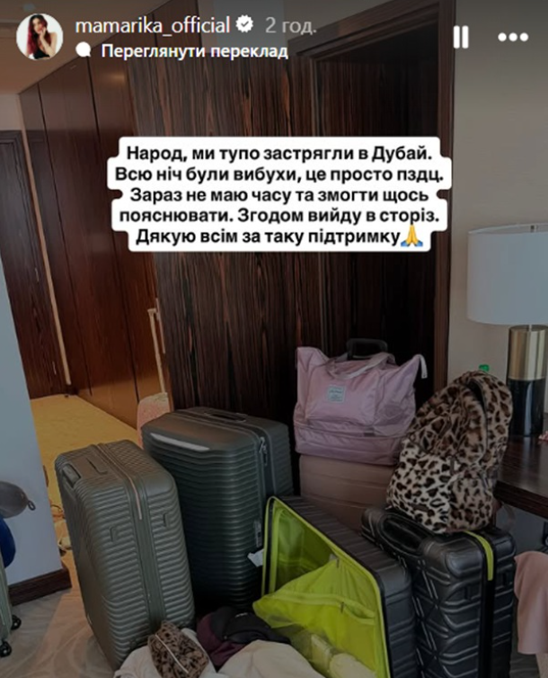 До дописи вона додала фото з підземного паркінгу — саме там вона разом з іншими людьми пересиділа обстріл. Повернутись додому поки неможливо: авіасполучення зупинено.