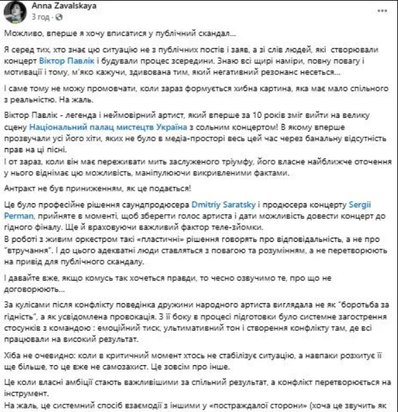 Співачка Анна Завальська, чоловік якої Дмитро Саратський працював саундпродюсером концерту, опублікувала розгорнуту відповідь у Facebook. За її словами, вона знає ситуацію зсередини — не з публічних заяв, а від людей, які безпосередньо створювали шоу.