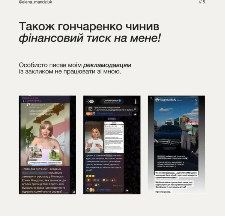 «Він провокував хвилю булінгу, яка призвела до блокування моїх сторінок, страшних погроз убивства мені та моїм дітям. Особисто писав моїм рекламодавцям із закликом не працювати зі мною. На своїх соцмережах закликав бізнеси припинити співпрацю, маніпулюючи вигаданими фантазіями», — розповіла блогерка.