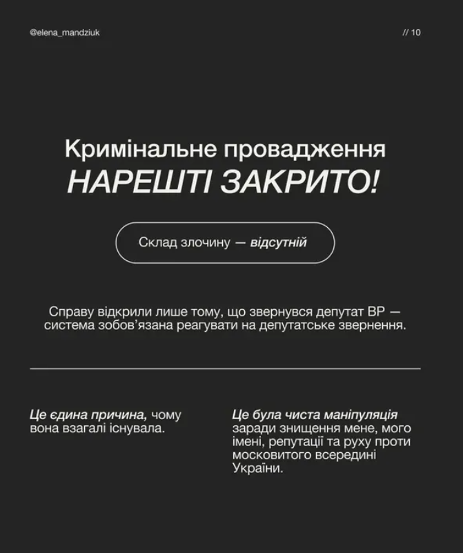 Закриття справи Мандзюк сприйняла не як фінальну крапку, а як підтвердження того, що робила правильно. «Рік тиску, булінгу та маніпуляцій — і тепер справу закрито. Я продовжуватиму допомогу та підтримку всього українського, військових, хоч і в менших об'ємах», — запевнила вона.